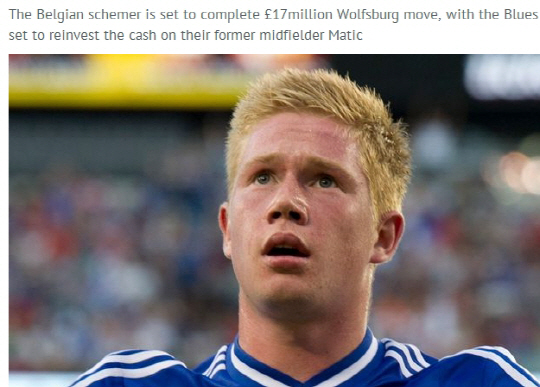 14일(한국시각) 영국 일간지 데일리미러는 첼시가 마티치 영입 자금을 마련하기 위해 케빈 데 브루잉을 판다고 전했다. 데 브루잉의 행선지는 볼프스부르크로 이적료는 1000만파운드로 알려졌다. 양 구단은 합의를 마친 것으로 알려졌다.