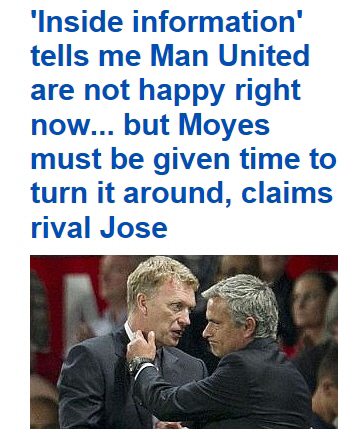 부진으로 인해 경질론이 일었던 모예스 감독의 거취와 관련 "맨유는 팀리빌딩을 위해 감독에게 충분한 시간을 줄 것"으로 전망했다. 무리뉴는 "모예스 감독이 압박감에 시달리고 있다고는 보지 않는다. 압박감은 최상의 결과를 가져오지 못했을 때, 미디어로부터 오는 가상의 것일 뿐이다.가장 중요한 것은 외부로부터 압박감이 아니라, 내부의 현실"이라고 주장했다. "이 사람이 앞으로 2,3,4,5년을 함께할 우리팀 감독이라고 생각하면 팀은 하나가 된다. 팀을 재건해 훌륭한 팀으로 만들어갈 수 있다"고 설명했다.