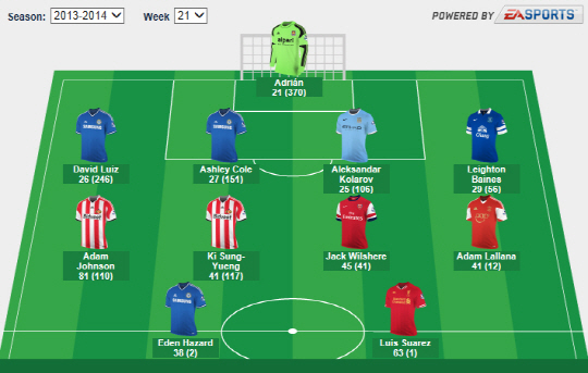 스토크시티전에서 2골을 넣은 루이스 수아레스(리버풀)와 에당 아자르(첼시)는 21라운드 최고의 공격수로 뽑혔다. 레인턴 베인스(에버턴)와 콜라로프(맨시티), 애슐리 콜, 다비드 루이스(이상 첼시)는 수비 부문에 이름을 올렸다. 최고의 골키퍼 자리는 아드리안(웨스트햄)이 차지했다.