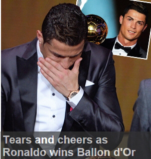 | 발롱도르 수상자로 결정된 뒤 눈물을 흘리고 있는 호날두. |