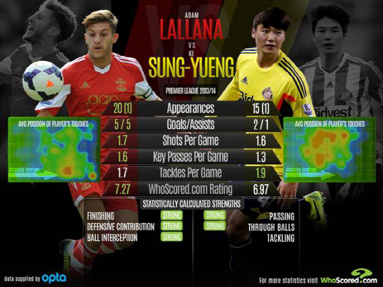 기성용에 대항할 사우샘프턴의 대표 선수는 잉글랜드 대표팀의 공격형 미드필더 아담 랄라나(25).