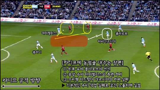 맨시티의 '화력 예찬론'은 다소 진부한 레퍼토리가 됐다. 툭 하면 5~6골씩을 투하했으니 이제 4득점 정도는 예삿일. 중앙 수비 두 명, 좌우측 풀백 중 하나, 그리고 하비 가르시아 정도가 남았고, 나머지는 중앙선 위로 넘어가 상대를 몰아놓고 때리기 바빴다. 후방에서 투입되는 전진 패스는 대부분 측면에서 들어오는 맨시티 윙어의 몫이었고, 이를 견제하지 못한 카디프는 수비 위치를 재조정하느라 정신이 없었다. 이 과정에서 네그레도-제코의 투톱은 성실하게 상대 수비를 끌어냈고, 실바, 나바스, 야야 투레, 사발레타는 이들과의 동선이 겹치지 않도록 그다음 연계 동작을 이어나갔다.