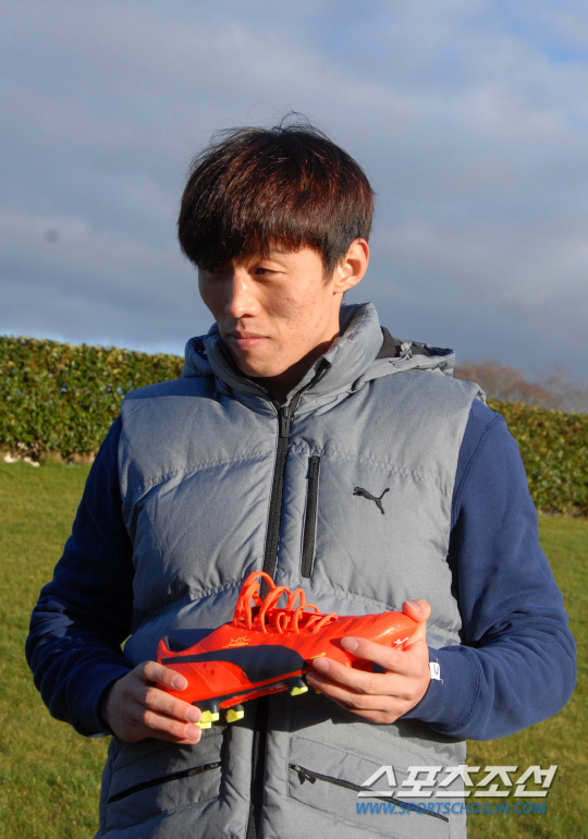 김보경이 푸마의 에보파워를 들고 이야기를 하고 있다. 카디프(영국)=이 건 기자 bbadagun@sportshcosun.com