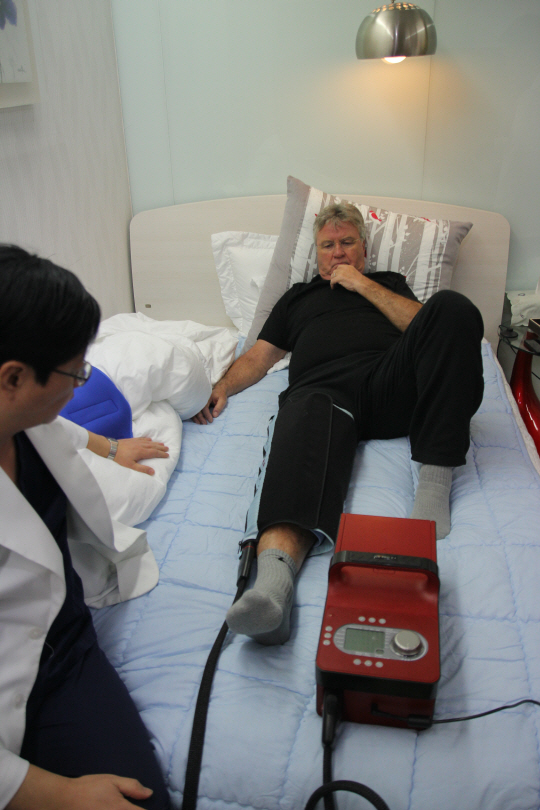 | ◇히딩크 감독이 수술 뒤 냉각압박치료를 받고 있는 모습. 사진제공=서울제이에스병원 |