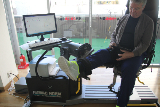| ◇히딩크 감독이 오른쪽 무릎 수술 재활 차 특수치료를 받고 있는 모습. 사진제공=서울제이에스병원 |
