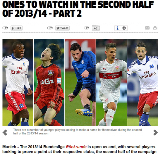 독일 분데스리가는 22일 공식 홈페이지를 통해 '2013~2014시즌 후반기 주목해야할 영스타 5인'을 선정했다. 이번에 선정된 5명은 21일 발표한 '주목해야할 선수 5인 파트1'에 이은 명단이다. 당시 명단에는 구자철(25·마인츠) 지동원(23·아우크스부르크)이 포함된 바 있다.