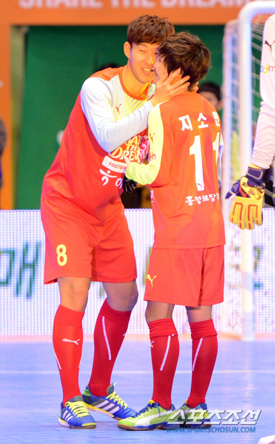 29일 잠실실내체육관에서 홍명보 자선 축구대회 '셰어 더 드림(Share the Dream) 풋볼 매치 2013'가 열렸다. 이번 11회 자선행사에서는 K리그 올스타인 희망팀과 해외리그 올스타 사랑팀의 맞대결로 펼쳐졌다. 희망팀에는 이번 시즌 K리그 최우수선수인 김신욱과 정대세 등이 포진했고, 사랑팀은 독일 분데스리가에서 활약 중인 손흥민과 구자철 등이 주축을 이뤘다. 사랑팀 손흥민이 지소연에게 키스 세리머니를 펼치고 있다. 잠실실내체= 김경민 기자 kyungmin@sportschosun.com / 2013.12.29.