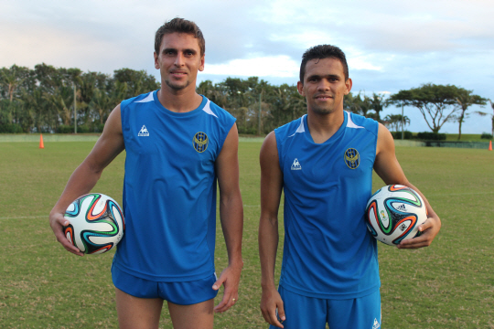 K-리그 클래식 인천 유나이티드의 브라질 듀오 이보(28)와 주앙파울로(26)가 '홍명보호'의 기량을 높이 평가했다. 이번 겨울이적시장에서 인천으로 온 두 선수는 요즘 괌에서 전지훈련을 하고 있다. 주앙파울로는 '홍명보호'의 브라질월드컵 예상 성적을 묻는 질문에 "한국은 2014년 런던올림픽에서 뛰어난 실력을 과시하며 동메달을 따냈다. 홍명보 감독은 월드컵에서도 좋은 성적을 낼 것이다"고 전망했다. 이보도 "한국은 4강에 오를 정도의 전력을 갖췄다고 생각한다. 정말 그렇게 됐으면 좋겠다"고 고개를 끄덕였다. 두 선수는 우승국 전망에 대해선 "브라질"이라고 입을 모았다.