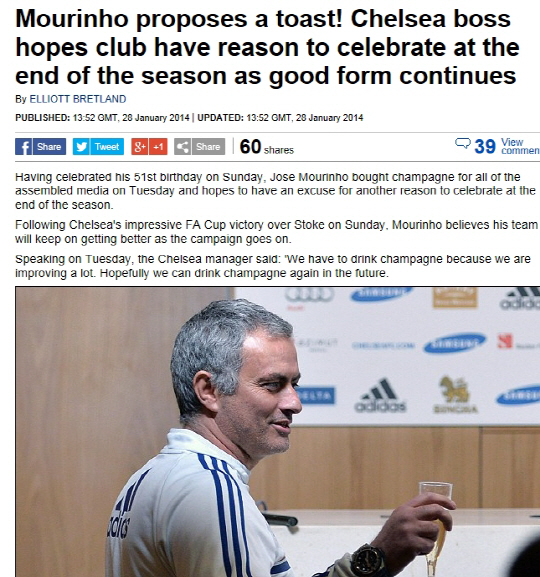 영국 일간 데일리메일에 따르면, 무리뉴 감독은 28일(한국시각) 기자단에게 샴페인을 돌려, 생일을 자축했다. FA컵 스토크시티전에서 오스카의 결승골로 1대0 승리를 거둔 직후, 무리뉴는 첼시의 지속가능한 성장에 기대감을 표했다. 28일 기자단에게 샴페인을 선물하며, 건배를 제안했다. "우리는 오늘 샴페인을 마셔야 한다. 왜냐하면 우리팀이 많이 성장했기 때문이다. 이 샴페인을 가까운 미래에 또한번 마실 수 있기를 희망한다"고 말했다. 리그 정상을 향한 거침없는 야망을 드러냈다.
