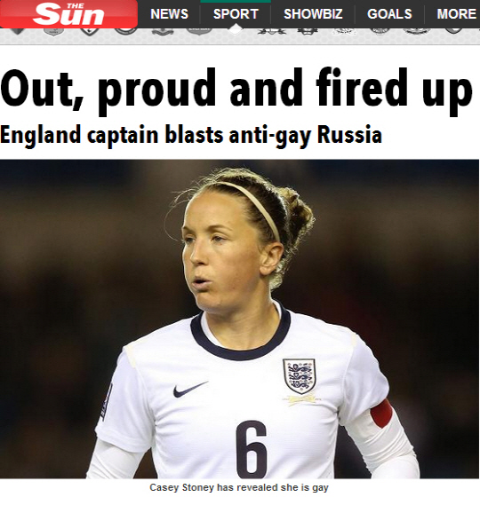 영국 일간지 더선은 11일 '잉글랜드 여자 축구 대표팀 주장이자 동성애 선수인 케이시 스토니(31)가 러시아를 비난하고 나섰다'고 전했다. 스토니는 "나는 (동성애자이기 때문에) 러시아나 카타르에서 개최되는 월드컵을 보러 갈 수 없다"며 "소수자를 인정하지 않는 이런 나라들에서 월드컵이나 올림픽이 열린다는 게 그저 놀라울 뿐"이라고 비아냥 댔다. 그는 "러시아 대통령은 동성애자들이 러시아를 방문하되 어린이들 가까이 가지는 말라고 말했다던데, 도대체 무슨 생각인지 모르겠다"고 목소리를 높였다.