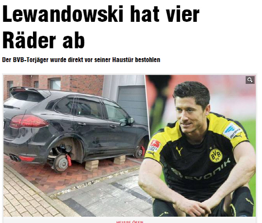 독일 일간지 빌트는 11일(한국시각) 트위터를 통해 4개의 바퀴가 모두 빠진 레반도프스키의 차 사진을 공개했다. 괴한들이 레반도프스키가 자택 앞에 세워둔 차를 들어 올려 바퀴를 빼낸 채 방치한 것이다. 바퀴를 뺀 뒤에는 양 사이드실에 벽돌을 대놓았다. 이로 인해 사이드실을 비롯한 차체 하부가 크게 손상됐으며, 견인과정에서 추가 손상이 일어난 것으로 알려졌다. 레반도프스키의 애마는 포르쉐 카이엔으로, 독일 현지에서 9만6000유로(약 1억4000만원)에 판매되고 있다.