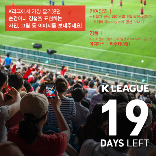 이벤트 참여 방법은 K-리그에서 가장 즐거웠던 순간이나 경험을 표현하는 사진 등 이미지를 K-리그 공식 페이스북 담벼락에 남기거나 K-리그 공식 트위터에 멘션을 보내면 된다.