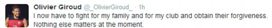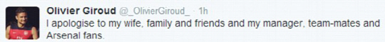 사태의 심각성을 깨달은 지루는 자신의 트위터에 곧바로 사과문을 올렸다. '아내와 가족, 친구, 감독, 동료들, 아스널 팬들에게 사과한다'고 썼다. 리버풀과의 FA컵 경기 직전 '나는 이제 내 가족과 클럽을 위해 싸워야만 하고, 용서를 구해야만한다. 지금 이순간 어떤 것도 이보다 더 중요한 것은 없다'는 말로 지난해 6월 아들 폴을 낳아준 아내 제니퍼와 구단, 팬들에게 뒤늦게 용서를 구했다.