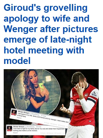 영국에서 모델로 활약 중인 셀리아 케이는 최근 '지루가 지난 2일 크리스탈팰리스전을 반나절 앞두고 선수단과 함께 들어간 호텔에 나를 불러들였다'고 폭로했다. 아스널은 경기 하루 전 선수단 전원이 호텔에 투숙하지만, 외부인과의 접촉은 엄격히 금지되어 있다. 영국 일간지 더선이 이를 대서특필하면서 진위 여부에 관심이 쏠려 왔다. 지루가 백기를 들었다. 지루는 이튿날 자신의 트위터를 통해 '내 아내와 가족, 친구와 감독, 팀 동료, 아스널 팬 등 모두에게 사과?나'며 '지금부터 가족과 클럽 외에 다른 것은 생각하지 않고 싸울 것'이라고 다짐했다.