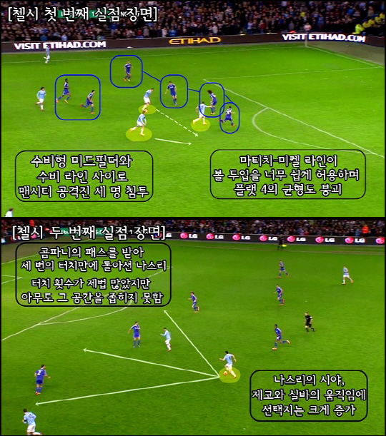 가장 큰 문제는 2선 공격진의 수비력. 첼시가 맨시티를 두 번이나 잡았던 비결은 공격력보다는 수비력에 있었다. 그러나 이번엔 다비드 실바와 야야 투레의 탈압박을 통한 볼이 첼시 진영으로 살아 들어오기 시작했다. 마티치-미켈의 수비 짐은 급격히 증가했고, 케이힐-다비드루이스 또한 앞뒤로 커버해야 할 공간이 늘어났다. 첫 실점을 내준 것도 결국엔 느슨한 수비 블록 탓. 다비드루이스의 간격 조절이 아쉬웠고, 밀너의 움직임에 끌려간 아스필리쿠에타의 수비 위치가 슈팅 기회를 내줬지만, 정녕 지적받아야 할 점은 지공 상황에서 볼이 너무 쉽게 들어오도록 내버려뒀다는 것이다.