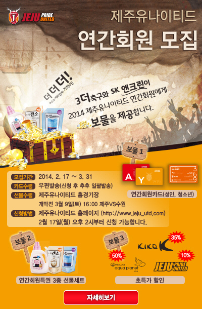 제주 유나이티드(SK에너지 축구단)가 2014시즌 연간회원권 판매를 시작한다. 제주는 17일 오후 2시부터 3월 31일까지 구단 공식 홈페이지(www.jeju-utd.com)를 통해 2014시즌 연간회원권을 판매한다. 연간회원권 가격은 성인 6만원, 청소년 3만원이며 건전한 스포츠 문화 확산을 위해 JDC와 SK 에너지의 협찬을 받아 초등학생 어린이를 상대로 연간회원카드 배포 캠페인을 전개한다. (연간회원카드는 제주교육청을 통해 일괄 배포 예정)