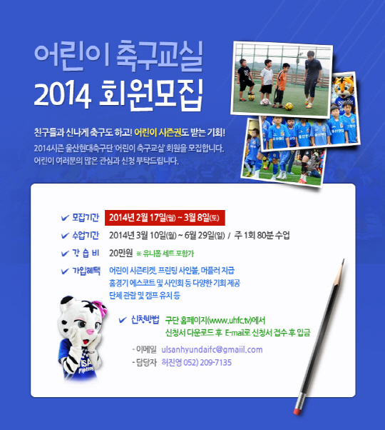 이번 축구교실 가입 시 다양한 혜택도 부여한다. 울산의 2014시즌 전 경기 관람이 가능한 어린이 회원으로 자동가입 돼 구단 머플러, 사인볼을 받을 수 있다. 시즌 중 에스코트 키즈로 참여할 수 있는 혜택이 주어진다. 뿐만 아니라 울산 선수가 직접 참여하는 사인회 및 특별 강의와 학부모들을 위한 교육 프로그램을 신설하여 아이들과 학부모들 모두 만족할 수 있는 축구교실을 운영한다.