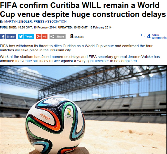 내린바 있다. 현재 브라질월드컵이 열리는 12개 경기장 중 8개 구장이 완공됐다. 아직 4개 구장이 공사 중인데 쿠리치바 경기장이 가장 느린 편이다. 이미 완공 예정 시기도 수 차례 넘겼다. 현재 완공률은 90%다. FIFA와 브라질월드컵 조직위원회는 4월 중순까지 모든 경기장을 완공하겠다고 약속한 것으로 알려졌다.