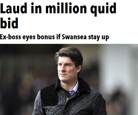 그러나 스완지시티는 재계약 결정으로 인해 큰 손해를 감수해야 할 위기에 처했다. 더 선에 따르면 라우드럽 감독은 잔여기간 연봉 전액인 450만파운드(약 80억원)를 스완지시티에 요구하고 있다. 이메일을 통해 일방적으로 경질을 당했으니 잔여 연봉을 모두 받겠다는 얘기다. 스완지시티는 200~300만파운드만 주는 것을 고려하고 있다. 그러나 더 선의 보도대로 리그 잔류시 100만파운드의 보너스를 약속했다면 스완지시티가 라우드럽 감독에게 지급해야할 돈은 더 늘어난다.