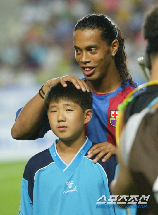 어린이와 함께 입장한 호나우딩요가 어린이의 머리를 쓰다듬고 있다.../2004.7.29.수원=정재근기자