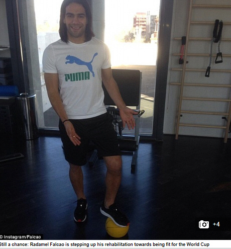 영국의 일간지 데일리 메일은 24일(한국시각) '팔카오가 브라질월드컵 출전을 위한 재활에서 큰 걸음을 했다'고 보도했다. 팔카오도 24일 자신의 소셜네트워크서비스인 인스타그램을 통해 재활과정을 공개했다. 사진 속 팔카오는 목발 없이 홀로 서 있었다. 심지어 함께 공개된 동영상에는 팔카오가 실내에서 가볍게 공을 터치하는 장면도 담겨있었다. 수영장에서 무릎 재활 훈련을 하는 팔카오의 모습도 공개됐다.