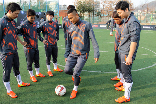 | 정대세가 25일 열린 푸마 에보파워 트라이얼데이에서 원포인트레슨을 하고 있다. 사진제공=푸마코리아 |