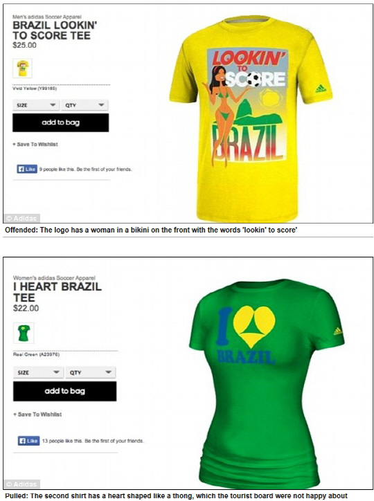26일(한국시각) 영국 일간지 데일리메일에 따르면, 브라질 관광청 이회사가 성적 이미지가 강한 월드컵 티셔츠에 대해 불만을 드러내 아디다스가 판매를 중지했다.