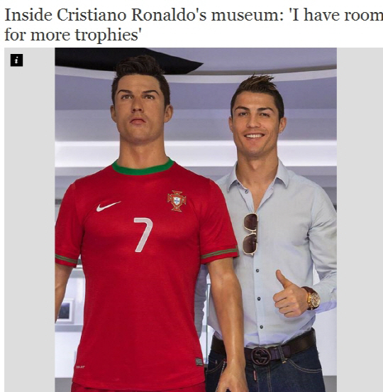 박물관에는 호날두에 관한 것이 모두 전시돼 있다. 2013년 수상한 발롱도르 트로피를 비롯해 메달, 사인볼, 셔츠 등 140여가지가 있다. 또 20년 전 그라운드를 누볐던 호날두의 어린시절 모습도 사진으로 감상할 수 있다. 게다가 호날두를 똑같이 닮은 실물인형도 전시돼 있다.