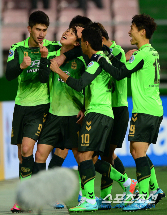 최강희 감독이 이끄는 전북현대가 26일 전주월드컵경기장에서 요코하마를 상대로 아시아축구연맹(AFC) 챔피언스리그 조별리그 1차전 홈경기를 펼쳤다. 후반 이승기가 선취골을 넣고 동료들과 함께 기뻐하고 있다. 전주=송정헌 기자 songs@sportschosun.com/2014.02.26