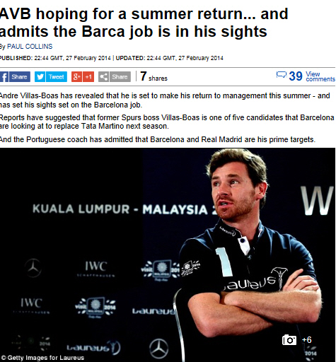지난해 12월 성적 부진으로 토트넘 사령탑에서 물러난 비야스-보아스 감독도 바르셀로나 사령탑에 큰 관심을 보이고 있다. 그는 데일리 메일과의 인터뷰에서 "바르셀로나나 레알 마드리드는 세계 최고의 팀이다. 나같은 젊은 감독이 두 팀 중 한 팀을 지도한다는 것은 정말 꿈과 같은 일이다"라고 밝혔다.