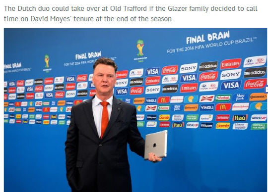 반할 감독과 데보어 수석코치 체제가 고개를 들고 있다. 반할은 브라질월드컵을 끝으로 감독직에서 물러난다. 그는 토트넘 등의 러브콜을 받고 있다. 반할 감독은 아약스, 바르셀로나, 바이에른 뮌헨 등에서 성공을 거두며 검증을 받았다. 데 보어 감독도 아약스를 이끌며 지도력을 인증받았다. 맨유는 데보어 감독에게 2인자를 맡긴 뒤 반할 감독의 후계자로 키우겠다는 계획이다. 이밖에 파비오 카펠로 러시아 감독과 위르겐 클럽 도르트문트 감독 역시 맨유 감독 후보로 꼽힌다.