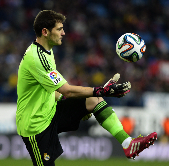| Real Madrid's goalkeeper Iker Casillas stops a ball during the Spanish Copa del Rey (King's Cup) semifinal second-leg football match Club Atletico de Madrid vs Real Madrid CF at the Vicente Calderon stadium in Madrid on February 11, 2014. ⓒAFPBBNews = News1 |