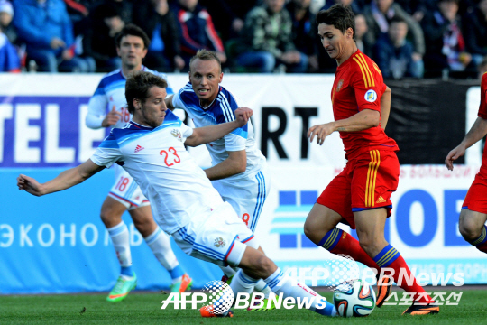 ◇러시아 수비수 드미트리 콤바로프가 5일(한국시각) 러시아 크라스노다르의 쿠반 스타디움에서 펼쳐진 아르메니아와의 평가전에서 수비수와 볼을 다투고 있다. 크라스노다르(러시아)=ⓒAFPBBNews = News1