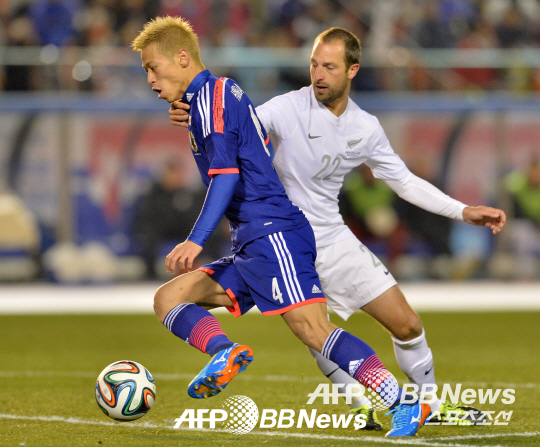 | ◇혼다 게이스케(왼쪽)가 5일 도쿄 국립경기장에서 펼쳐진 뉴질랜드와의 평가전에서 상대 수비수를 제치고 드리블 하고 있다. ⓒAFPBBNews = News1 |
