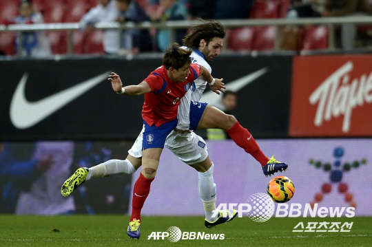 ◇홍정호(왼쪽)가 6일(한국시각) 그리스 아테네의 카라이스카키 스타디움에서 펼쳐진 그리스와의 평가전에서 그리스 공격수 게오르기오스 사마라스와 볼을 다투고 있다. 아테네(그리스)=ⓒAFPBBNews = News1