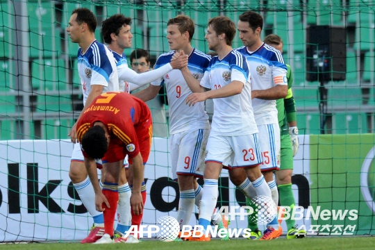 | ◇러시아 공격수 알렉산드르 코코린(가운데)이 5일(한국시각) 러시아 크라스노다르의 쿠반 스타디움에서 펼쳐진 아르메니아와의 평가전에서 전반 21분 선제골을 넣은 뒤 동료들의 축하를 받고 있다. 크라스노다르(러시아)=ⓒAFPBBNews = News1 |
