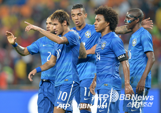 브라질이 6일(한국시각) 남아공 요하네스버그에서 열린 남아공과의 평가전에서 막강 화력을 자랑했다. 5대0의 대승을 거뒀다. 브라질의 '에이스' 네이마르(바르셀로나)가 기어코 해트트릭을 완성하며 팀 공격을 이끌었다.