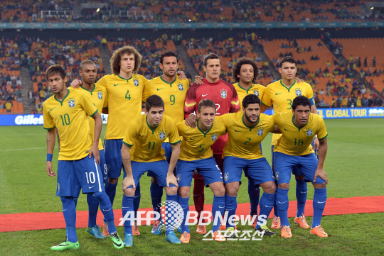 | 브라질과 남아공의 경기 시작전, 홈 유니폼을 입은 브라질 선수들. ⓒAFPBBNews = News1 |