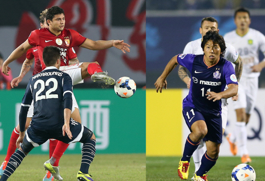 광저우 헝다 공격수 엘케손(왼쪽)과 산프레체 히로시마 공격수 사토 히사토. ⓒAFPBBNews = News1