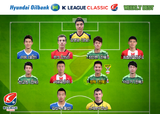 한국프로축구연맹은 12일 'K-리그 클래식 1라운드 최우수선수로 정 혁을 선정했다'고 밝혔다. 전북의 미드필더 정 혁은 지난 8일 전주월드컵경기장에서 열린 전북-부산의 클래식 1라운드에서 중거리 슈팅으로 두 번째 골을 기록하며 팀의 3대0 대승을 이끌었다. 연맹은 '중원에서 공수 조율과 함께 적극적인 공격 가담으로 팀의 대승을 이끌었다'고 정 혁의 플레이를 평가했다. 전북은 1라운드 베스트 11(4-4-2)에 4명의 선수 배출해 '1강'의 위용을 뽐냈다. 개막전에서 각각 1득점과 1도움을 기록한 미드필더 한교원과 이승기, 무실점 수비를 이끈 수비수 정인환(이상 전북)이 베스트 11에 이름을 올렸다. 마지막 미드필드 한 자리는 상주의 이 호가 차지했다. 최고의 공격수로는 김신욱(울산)과 스테보(전남)가 선정됐다. 정인환과 함께 최철순(상주), 루크(경남), 이 용(울산)이 최고의 수비수에 꼽혔다. 경남으로 임대 이적한 김영광이 1라운드 최고 골키퍼의 영예를 안았다.
