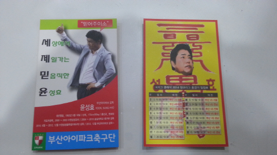 K-리그를 지배한 윤성효 감독의 존재감을 구단 및 일정 홍보에도 적극 활용하기 시작했다. 15일 현대오일뱅크 K-리그 클래식 포항과의 홈 개막전을 앞두고 이범영 김지민 주세종 윤정규 등 부산 선수들이 거리홍보에 나섰다. 이들의 손에는 윤 감독의 얼굴이 담긴 '스페셜한' 경기 일정표가 들려졌다. 명함 사이즈의 경기 일정표 전면에는 "세!제!믿!윤!(세상에서 제일가는 믿음직한 윤성효)윤성효"라는 표기와 함께 윤 감독의 '믿음직한' 사진을 담았다. "믿어주이소"라는 윤 감독 특유의 묵직한 경상도 사투리 코멘트가 눈길을 끈다. 뒷면에는 2013년 K-리그를 쥐락펴락했던 '성효부적'이 자리잡았다. 선수들은 부산 시민들에게 '성효부적'을 일일이 나눠주며, '특별한 기운'을 전달했다. 포항과의 개막전을 꼭 찾아달라는 부탁도 잊지 않았다. 이날 윤 감독의 명함을 건네받은 부산시민 양한나씨(19)는 "불쑥 내민 명함을 받았을 때 깜짝 놀랐다. 그래도 지니고 있으면 마치 한해가 편안해질 것 같은 느낌이 드는 명함"이라며 특별한 명함을 받은 소감을 전했다.