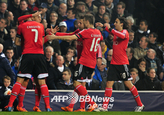 ◇벤피카의 로드리고가 전반 30분 선제골을 터트린 후 동료들과 함께 기뻐하고 있다. 런던=ⓒAFPBBNews = News1