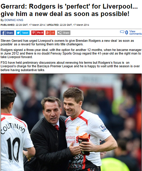 리버풀의 '캡틴' 스티븐 제라드가 리버풀 구단에 브랜든 로저스 감독의 계약 연장을 요구해 관심을 끌고 있다.