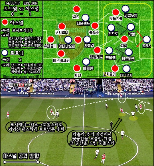 전반 1분 터진 로시츠키의 원더 골이 90분 동안 터진 유일한 득점이었다. 볼 경합 과정에서 체임벌린이 볼을 지켜내 전진했고, 가속도를 붙인 로시츠키가 흐르는 볼을 바깥 발등에 맞춰 황홀한 곡선을 만들어냈다. 아스널 진영 깊숙이 전진해 있던 대니 로즈는 수비 과정에 참여하지 못했으며, 카불이 지루에게 잡혀 있는 동안 베르통헌은 로시츠키와 체임벌린을 동시에 견제해야 했다. 에릭센이 부지런히 후진했으나 확실한 수비 성과를 내진 못 했다. 이 골 장면은 그저 '한 골' 들어간 데 그치지 않았다. 어쩌며 이번 북런던더비의 모든 것을 내포하고 있었다.