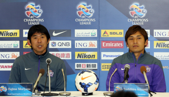 ◇FC서울과 맞닥뜨리는 모리야스 하지메 산프레체 히로시마 감독(왼쪽)과 주장 아오야마 도시히로가 18일 기자회견을 하고 있다. 히로시마(일본)=사진공동취재단