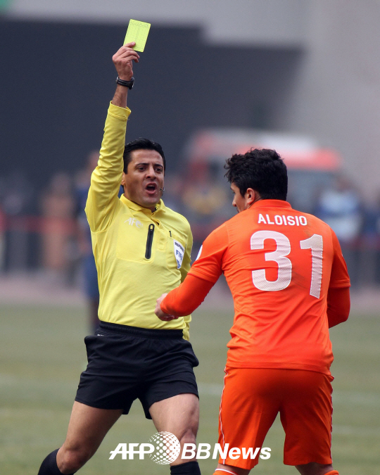 ◇산둥 공격수 산토스(오른쪽)가 지난달 25일 중국 지난의 올림픽 스포츠센터에서 열린 부리람과의 2014년 ACL 본선 조별리그 E조 1차전에서 경고를 받고 있다.