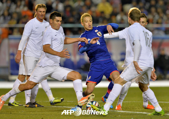 | ◇혼다(가운데)가 지난 5일 일본 사이타마 스타디움에서 펼쳐진 뉴질랜드와의 평가전에서 볼을 다투고 있다. ⓒAFPBBNews = News1 |