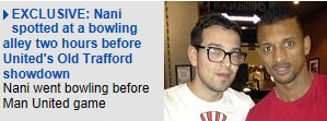 맨유 나니가 유럽챔피언스리그 올림피아코스(그리스)와의 경기 시작 2시간전 딘스게이트의 볼링장에서 목격됐다.