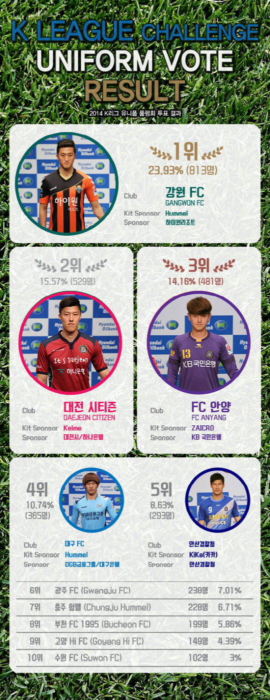 K-리그 챌린지의 강원FC가 올시즌 챌린지 최고의 유니폼 선정 및 우승 예상팀 선정 팬투표에서 2관왕을 차지했다.
