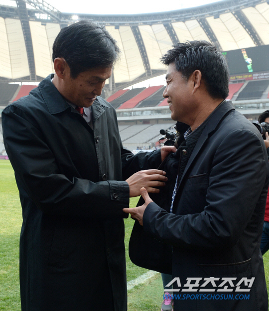 FC서울이 23일 서울 월드컵경기장에서 '현대오일뱅크 K리그 클래식 2014' 3라운드에서 부산아이파크와 맞대결을 펼쳤다. 경기 전 서울 최용수 감독과 부산 윤성효 감독이 인사를 나누고 있다. 상암=송정헌 기자 songs@sportschosun.com/2014.03.23